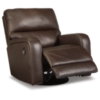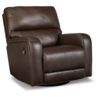 Embrace streamlined design. The sleek form of this swivel glider recliner is rich in tailored function. Its reclining, swivel and gentle rocking motions relax you in refined style. And the expertly matched leather and faux leather upholstery, in a deep neutral, levels up the recliner’s affordable luxury.